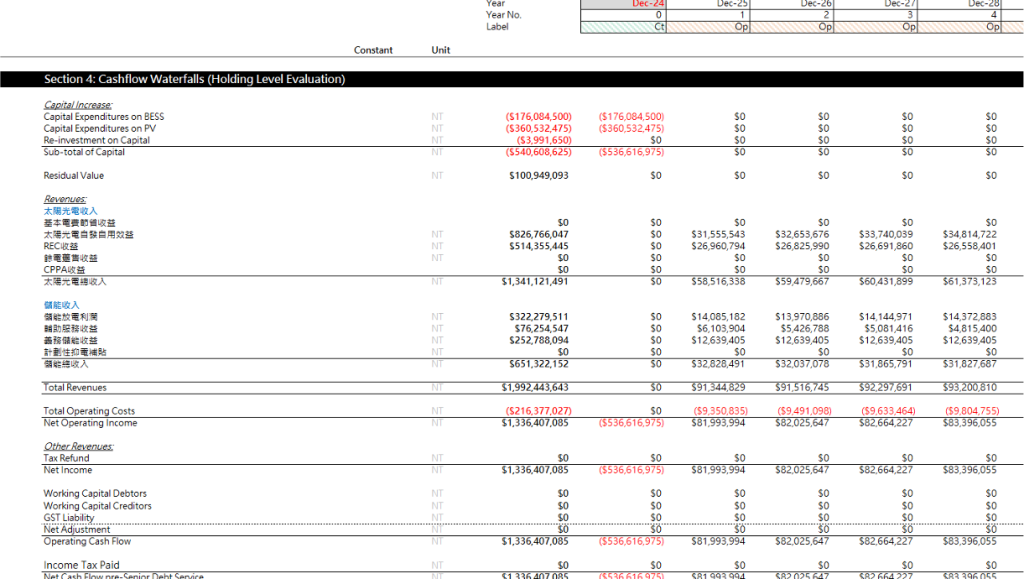 根據案場可能發生之一切成本,電價及物價漲幅,提供專業財務模型